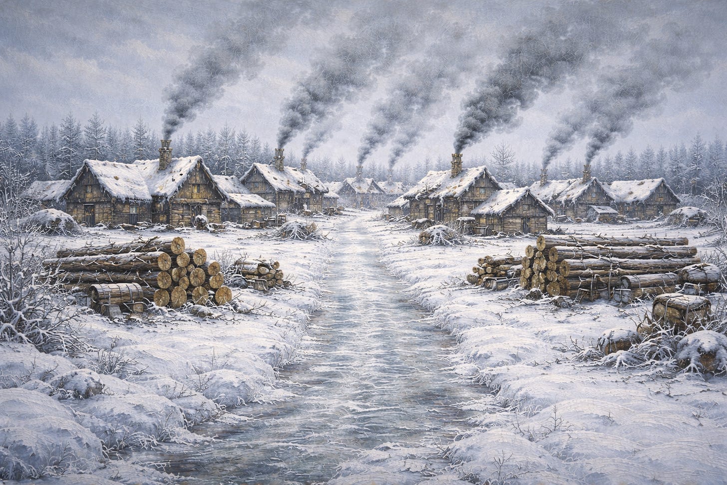 It was not as he anticipated. Smoke rose from more than a dozen buildings, each sporting solidly constructed wooden rooftops. A path through the center of the village could be discerned by packed ice, a few inches lower to the ground than the rest of the white landscape. Massive logs were piled high in various locations, suggesting that the growth was not finished.